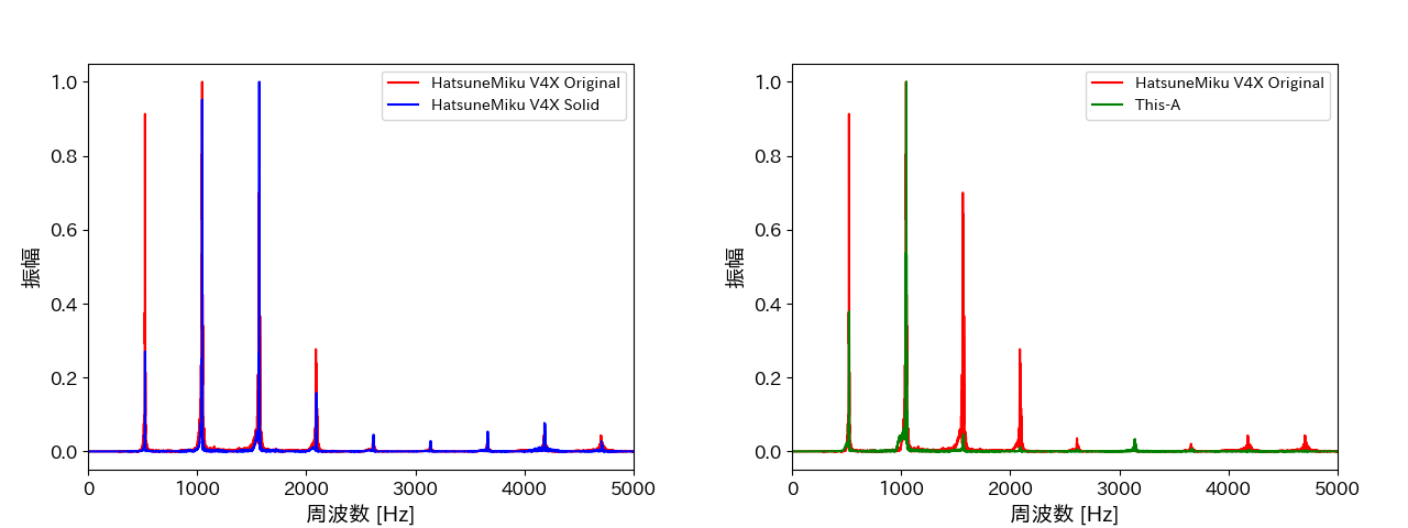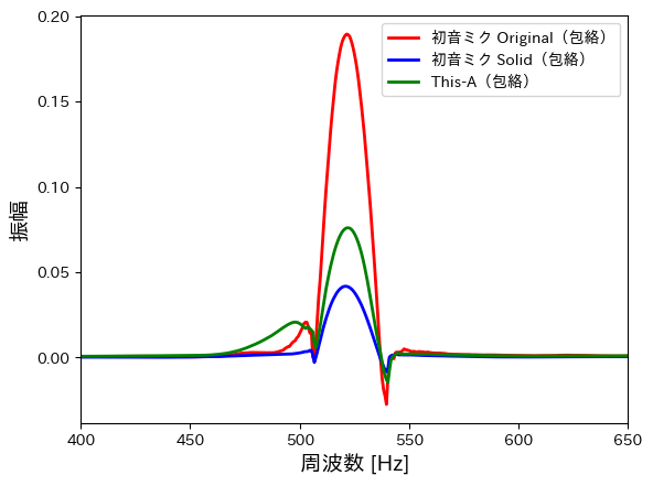初音ミク同士で見ると、Solidは500Hz付近のピークが弱いです。